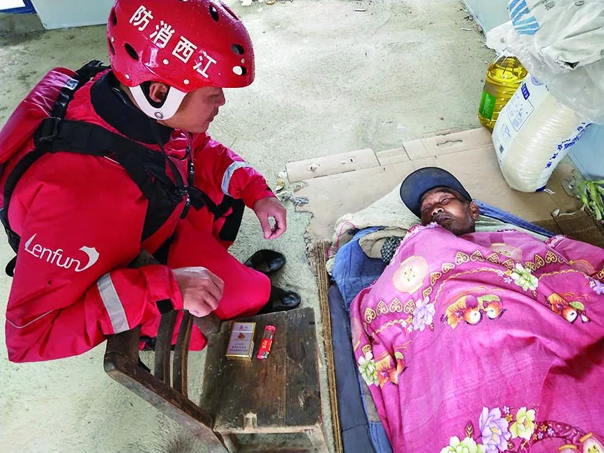 7月20日上午,宜春市消防救援支隊跨區(qū)域增援抗洪突擊隊在九江廬山市沙湖山鄱陽湖濕地生態(tài)保護區(qū)進行物資疏散轉移時,走訪慰問了一位84歲行動不便的受困老人。突擊隊員發(fā)現老人時,他正在一間滿地垃圾、沒有任何家具的空房間里;老人鋪著一張簡陋的竹簟躺在地上,身上僅蓋著一層破舊的薄被子,面黃肌瘦的樣子觸動了在場的每一位突擊隊員。
