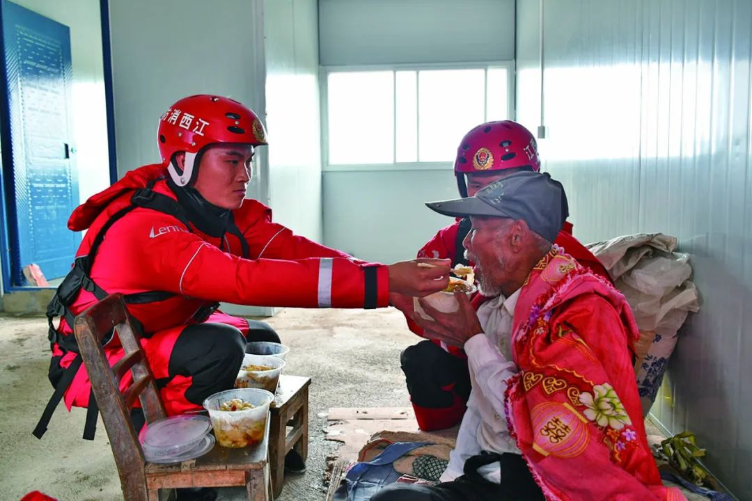 一名突擊隊員親切地握住老人瘦弱蒼老的手,和他耐心地交流起來。在老人囁嚅的聲音中,指戰(zhàn)員一遍又一遍地安慰著老人,告訴他“有我們在,不用怕”。隨后,抗洪突擊隊員又幫助老人打掃衛(wèi)生,整潔房間,并讓老人吃上了熱乎的飯菜。為了不讓老人嗆到,一名指戰(zhàn)員接過飯盒,一勺一勺地喂老人吃完,又為他留下了食用油、大米等日用品。